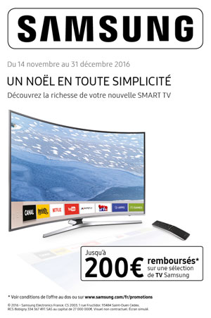 Modalit s Samsung offre Les bonnes affaires de No l 20AV SAMSUNG LES BONNES AFFAIRES DE NOEL 20AV OPERATION N PARIS CONCOURS 5. Tout dossier illisible, incomplet, frauduleux, ne respectant pas les. 1) Pour tout achat ou location entre le et le inclus dun t l viseur Samsung parmi les r f rences ci-dessous, Samsung vous rembourse jusqu 5dans la limite du montant acquitt pour le produit.